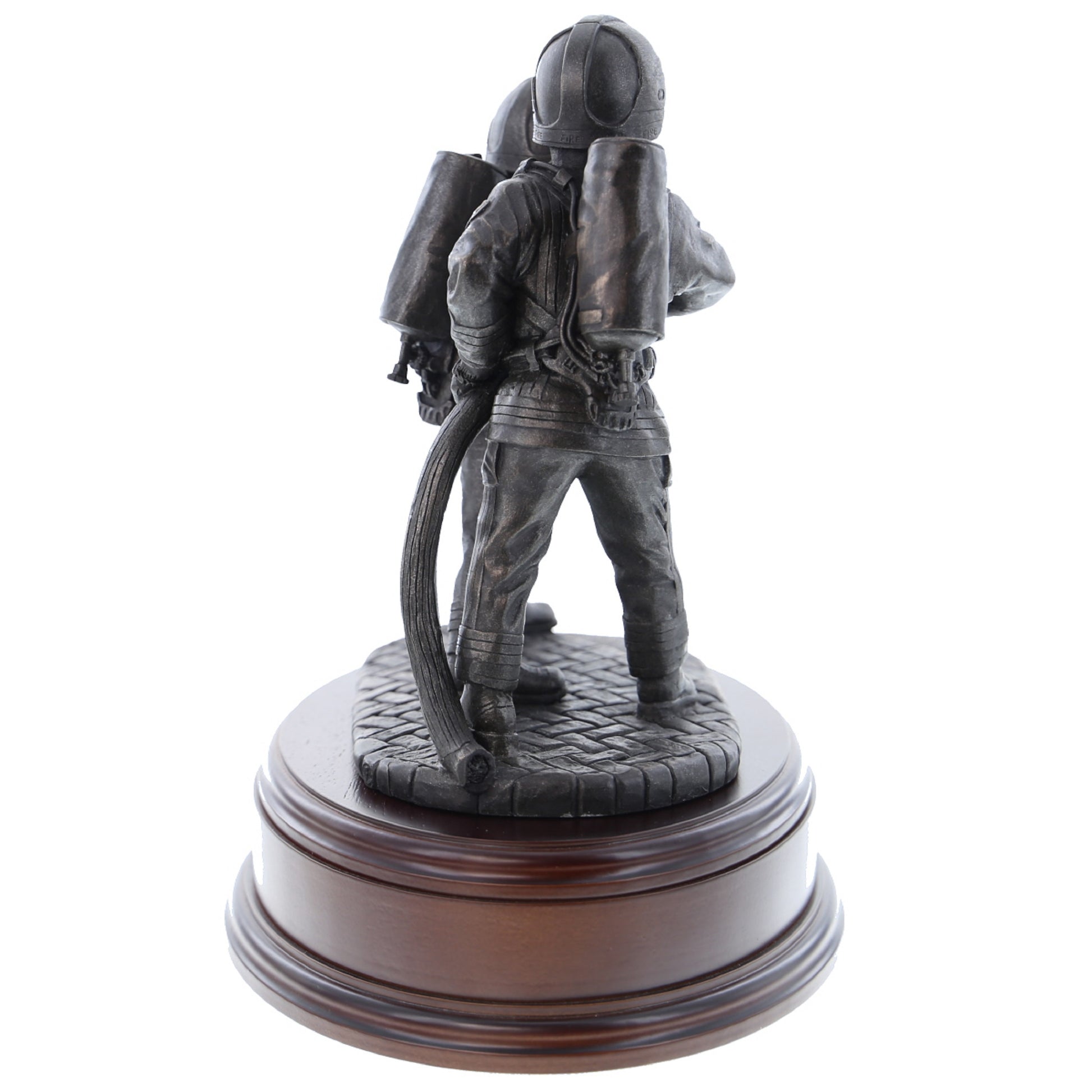 An 8" statuette of two firefighters wearing modern Cromwell F600 helmets tackling a fire on a branch.