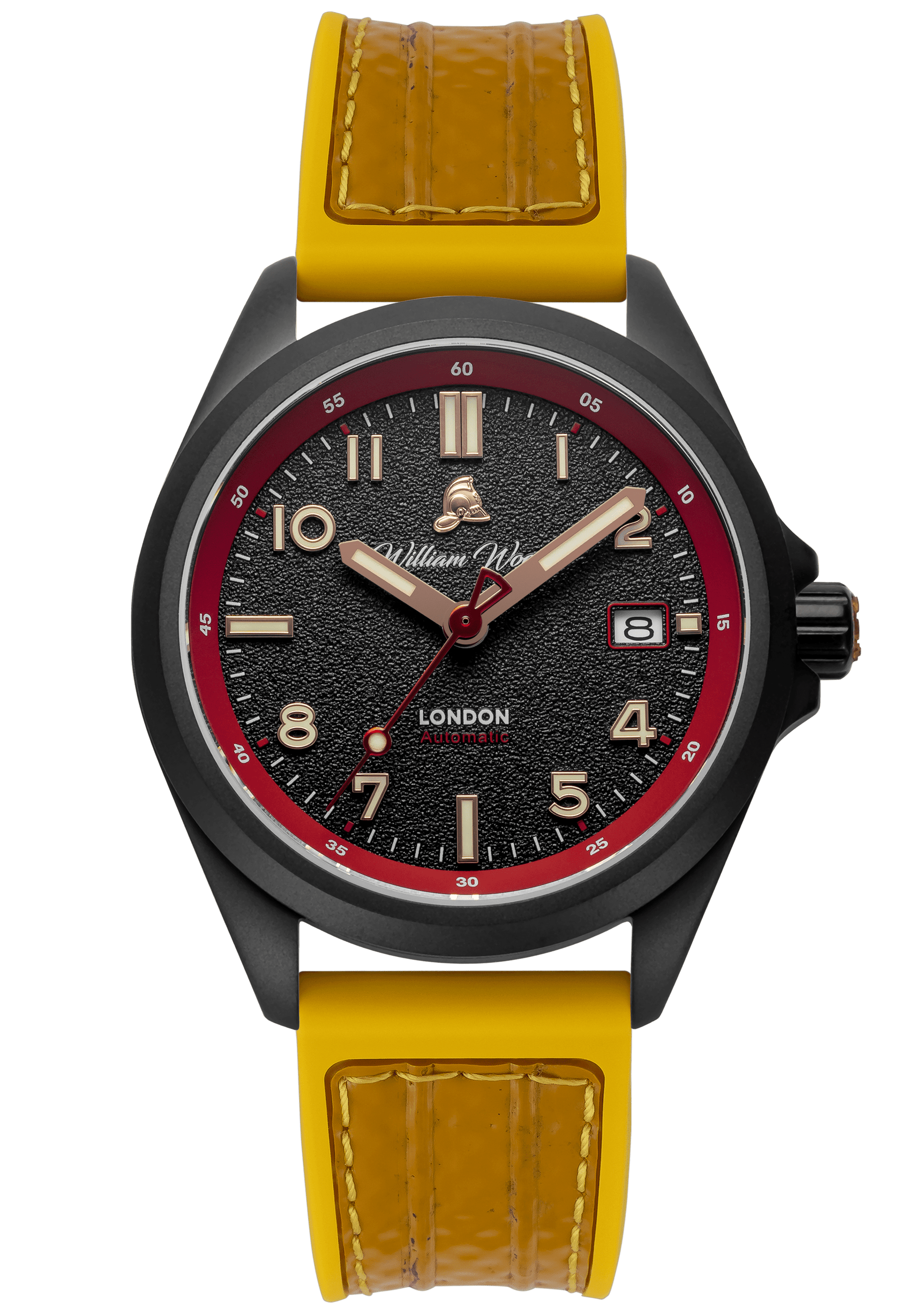 Our Fearless Collection is our rugged field watch ready for action and adventure. With a smaller compact case measuring 39mm and stealth matte black finishing. This watch is not only built for adventure but looks ready for action at the drop of hat. With a dial inspired by charcoal, applied rose gold indices filled with lume, and a caseback molded into a UK Fire & Rescue Service firefighter helmet with a coloured visor looking through to the movement.