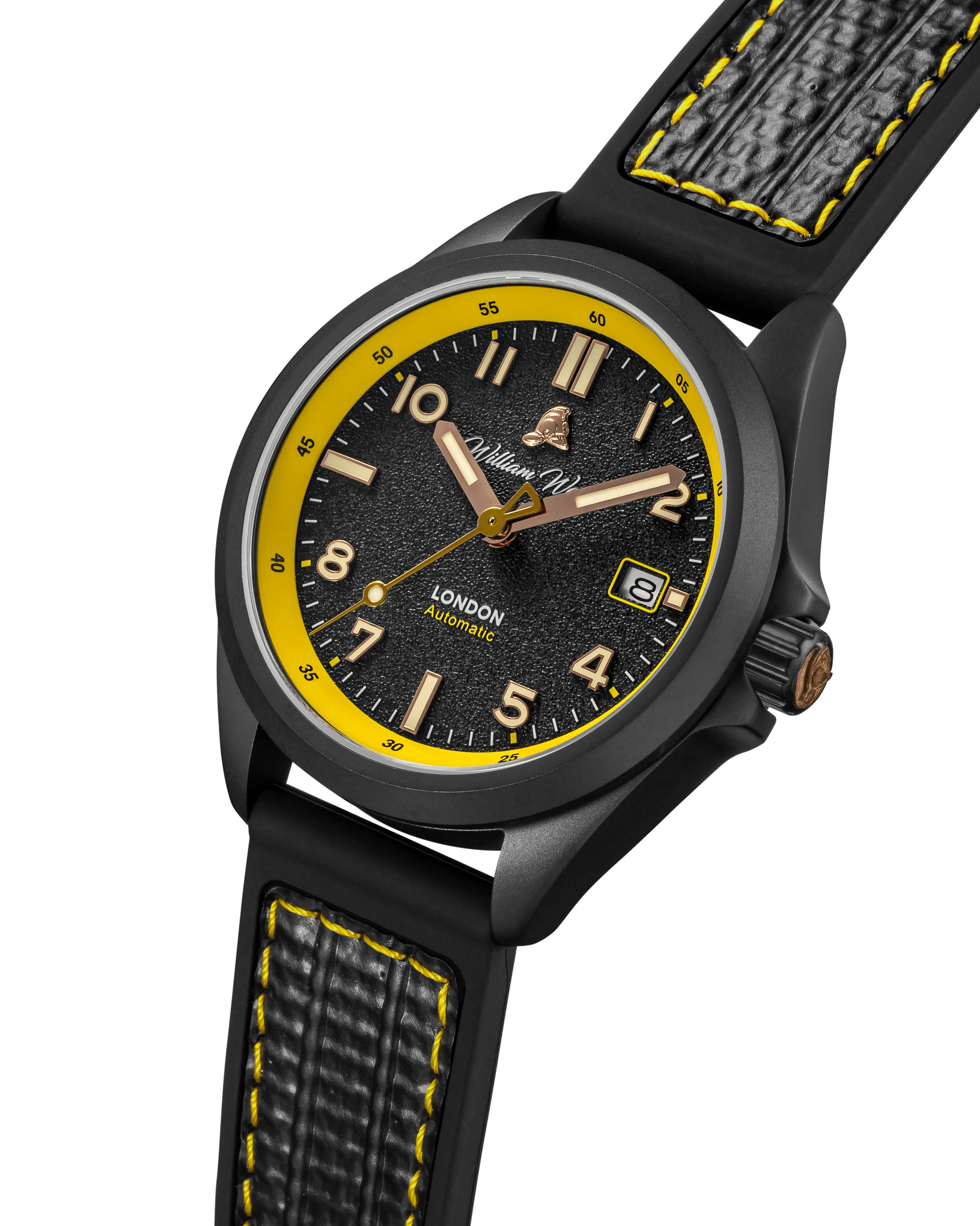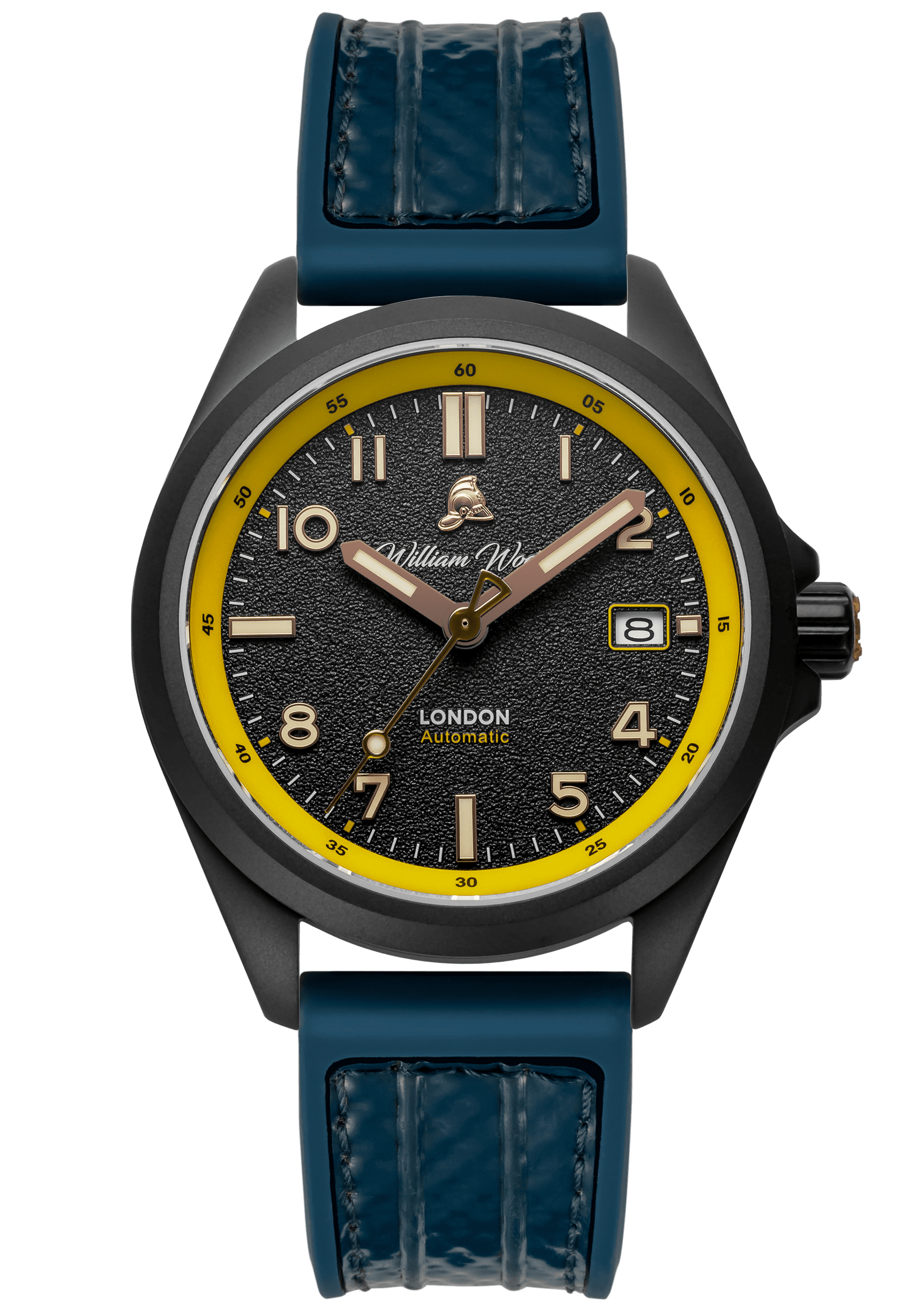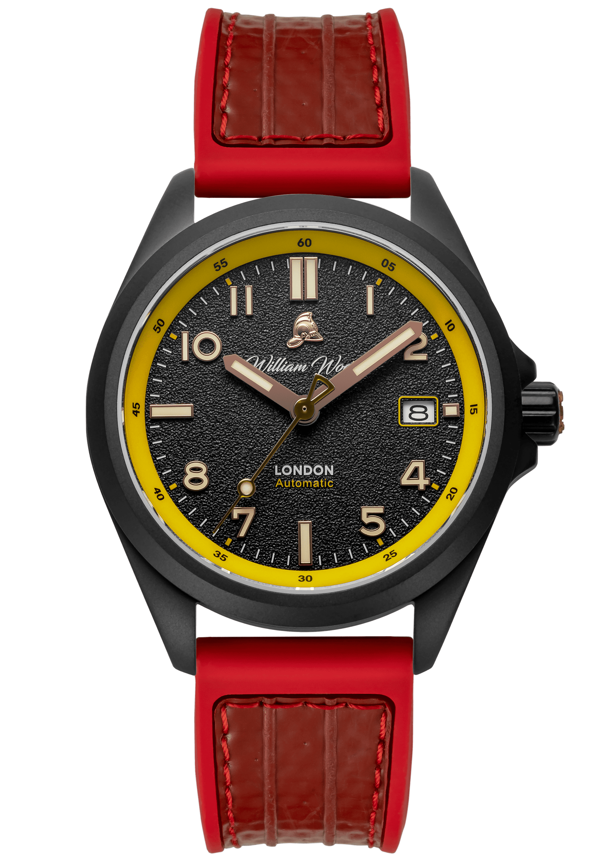 Our Fearless Collection is our rugged field watch ready for action and adventure. With a smaller compact case measuring 39mm and stealth matte black finishing. This watch is not only built for adventure but looks ready for action at the drop of hat. With a dial inspired by charcoal, applied rose gold indices filled with lume, and a caseback molded into a UK Fire & Rescue Service firefighter helmet with a coloured visor looking through to the movement.
