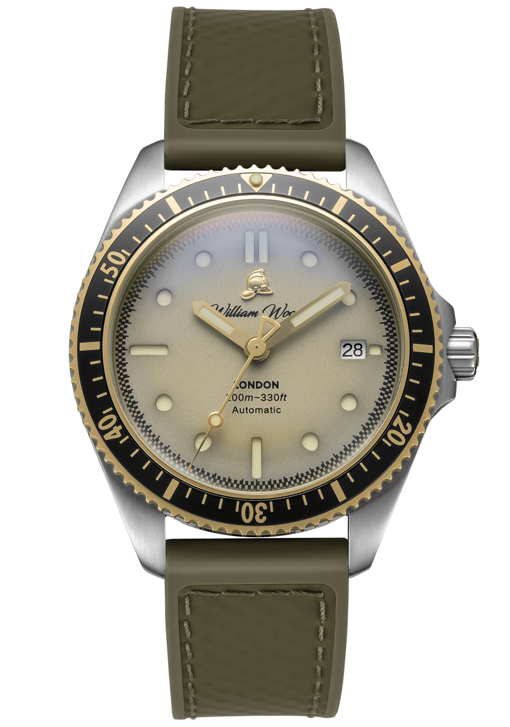 - Firefighter Helmet Crown: Placed inside the crown is an inset made from a 1920s British brass firefighter’s helmet. All the casting and craftsmanship is carried out in the heart of London’s prestigious jewellery district of Hatton Garden. Each inset is finished with the unique William Wood firefighter helmet logo engraving.